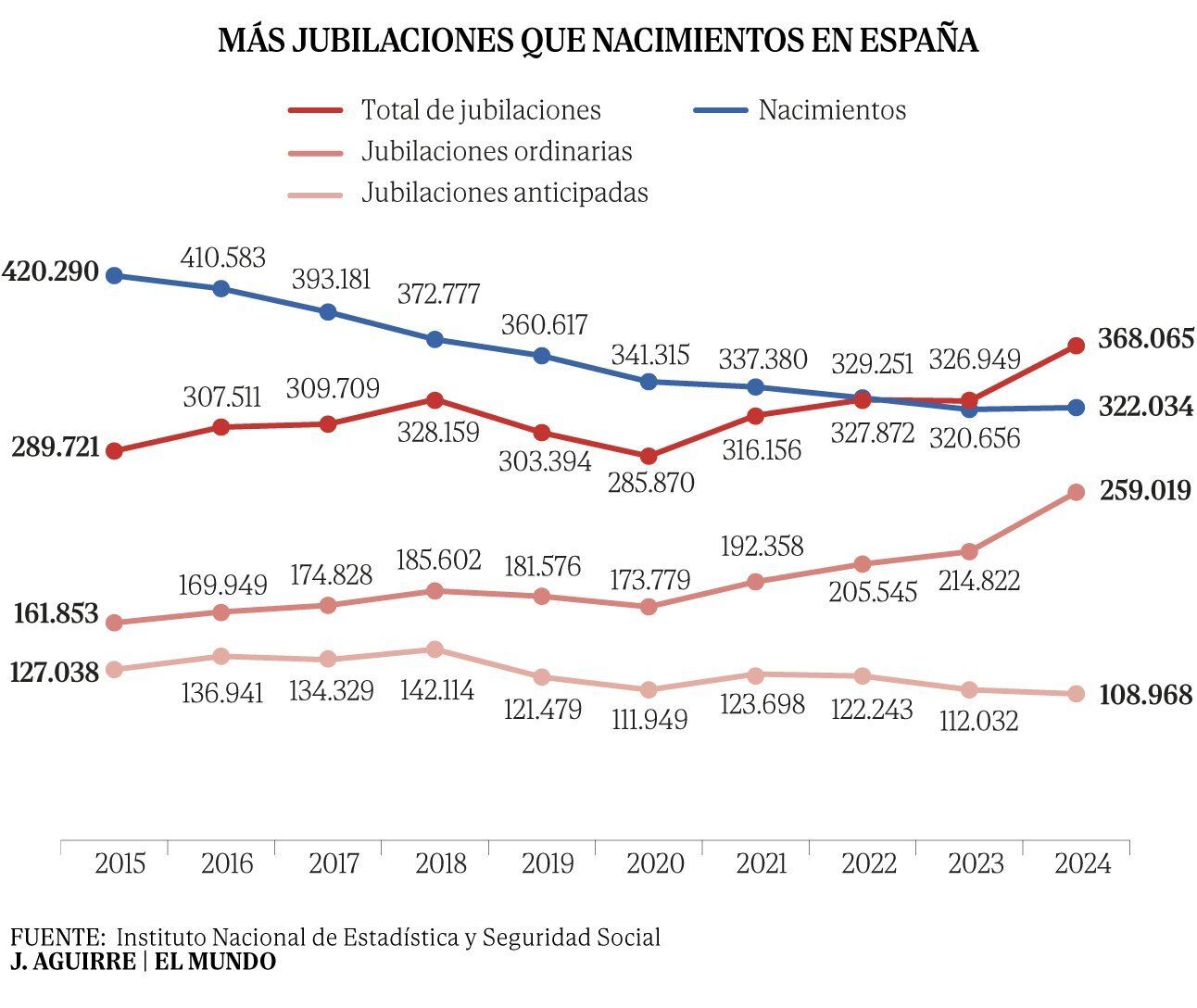 Los nuevos jubilados superan a los bebés nacidos en España por segundo año consecutivo. El aumento de jubilaciones en España, impulsado por la llegada de los baby boomers al sistema de pensiones, ha generado un récord histórico de 368.065 nuevas altas en 2024, un 12,6% mÔs que el año anterior. Este fenómeno agrava el desequilibrio demogrÔfico, ya que por segundo año consecutivo las jubilaciones superan los nacimientos. Aunque la natalidad creció un 0,4%, el ritmo de nuevas jubilaciones fue 30 veces mayor.