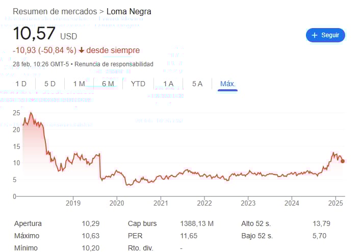 Loma Negra es el mayor productor de cemento de Argentina. Llevan aƱos y aƱos en el mercado, y eso se nota. Tienen un montón de fĆ”bricas y lugares donde venden sus productos por todo el paĆs, asĆ que llegan a todas partes. Ten en cuenta que a Loma Negra le va bien cuando a la construcción le va bien. Si la gente estĆ” construyendo mucho, ellos venden mĆ”s. Pero si la cosa se pone complicada, peligro. AĆŗn estĆ” retrasada si lo comparamos con su Ćndice de referencia y todavĆa no ha superado sus mĆ”ximos históricos.